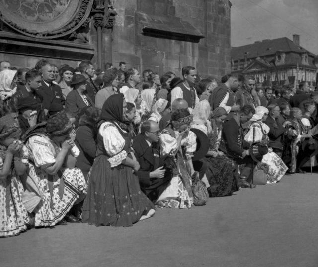 Pláč doprovázel zesnulého prezidenta TGM na jeho poslední cestě Prahou 21. září 1937. Záběr před orlojem na Staroměstském náměstí.