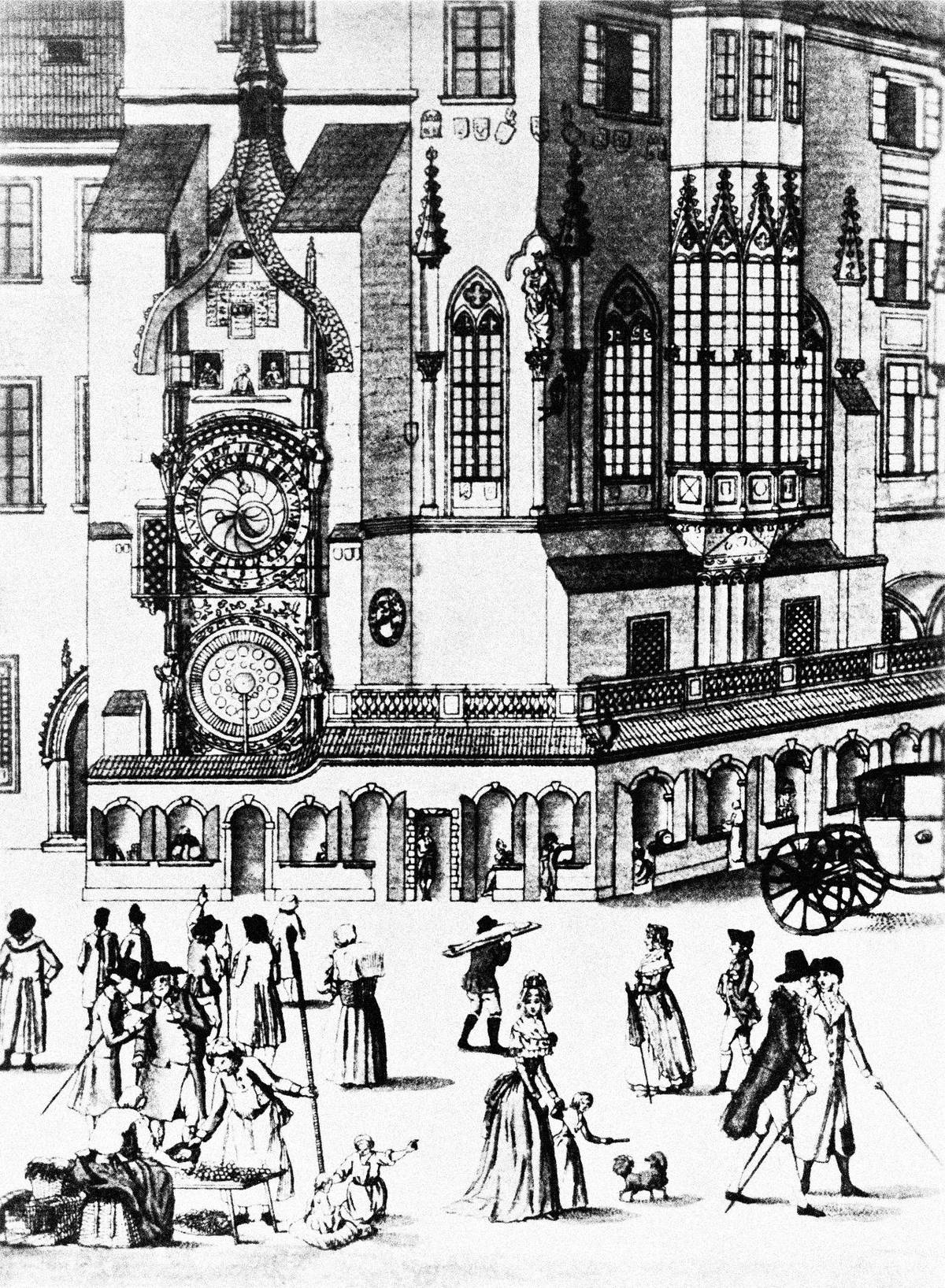 Staroměstský orloj v Praze v roce 1793 (kresba, rytina)