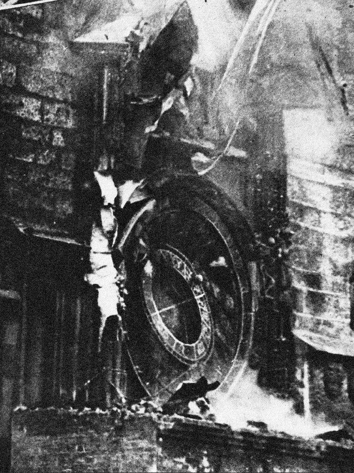 Zničený orloj v květnu 1945