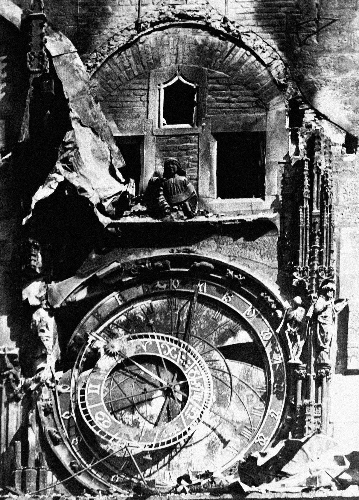 Zničen byl i pověstný orloj (1945).