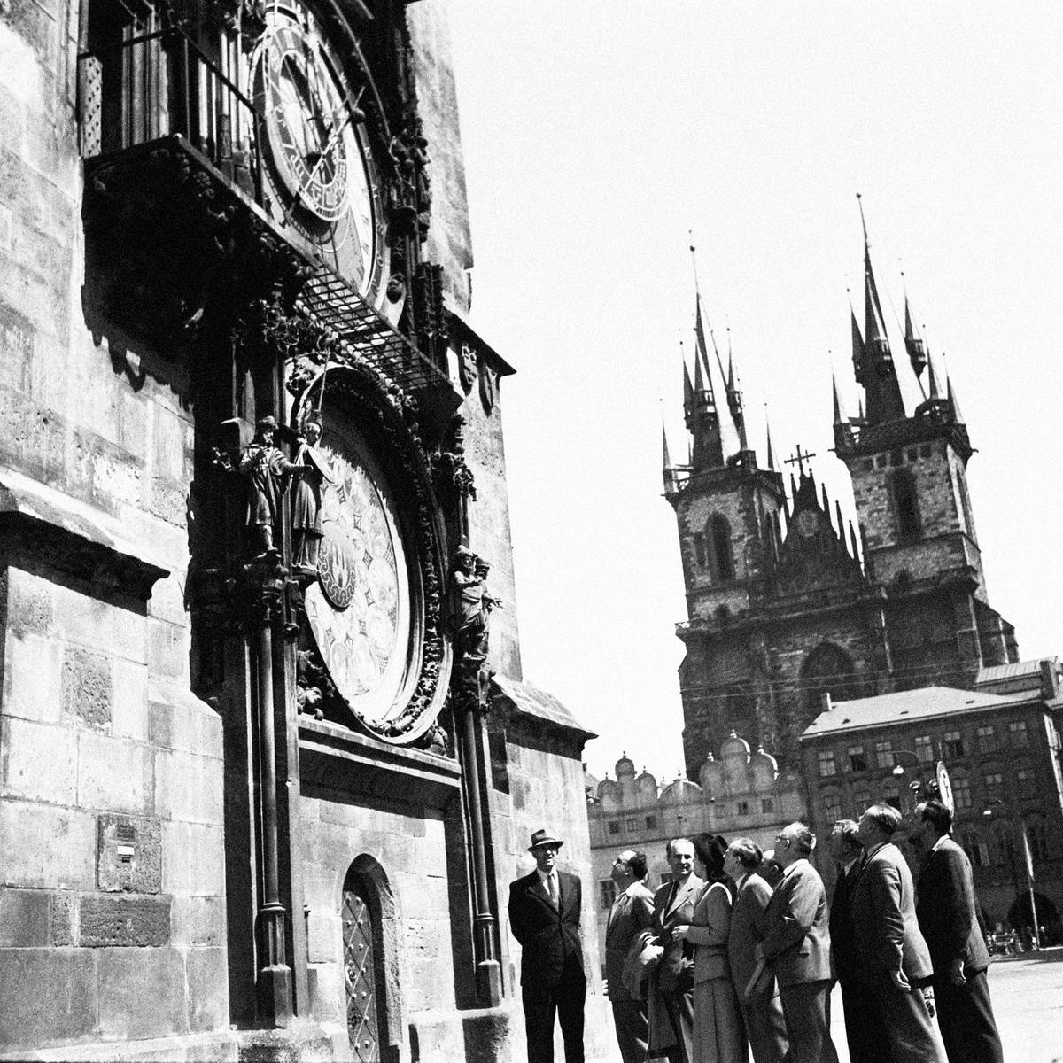Sovětští vojáci, kteří v Československu pobývali od okupace v roce 1968, si dvě desetiletí poté prohlížejí orloj na Staroměstském náměstí (1986).