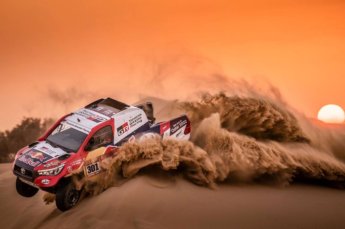 Kin Marcin: Nasser Al-Attiyah a Matthieu Baumel závodící za tým Toyota Gazoo Racing testují automobil v písečných dunách poblíž Dubaje.