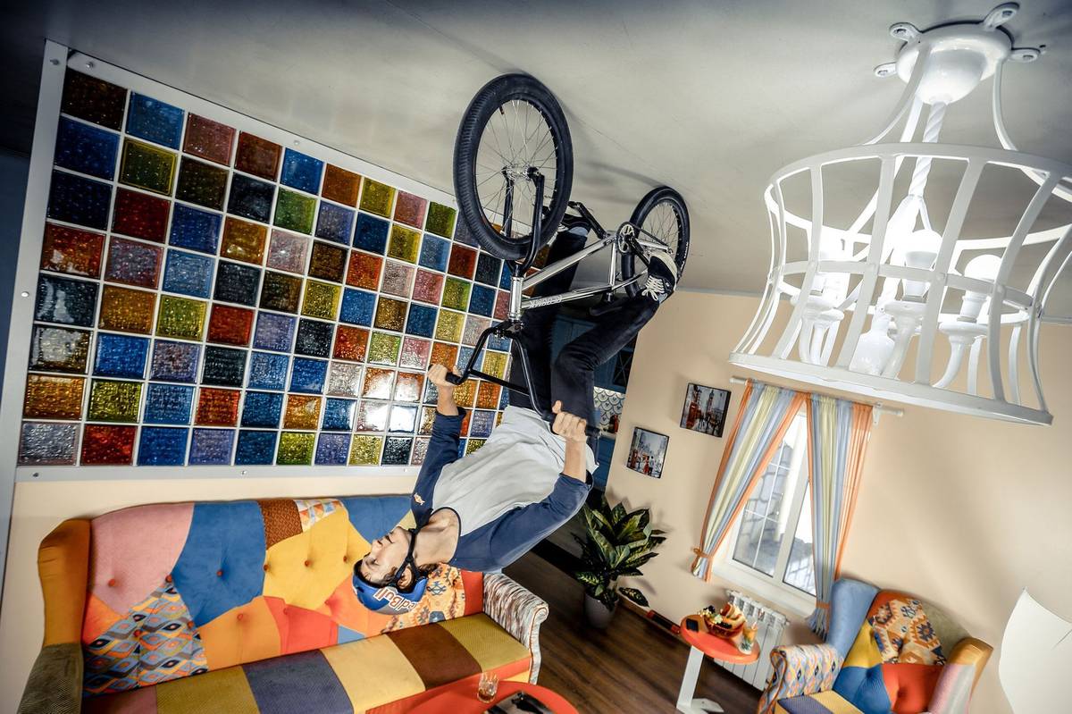 Pavel Sukhorukov: Bikrosař Irek Rizaev předvádí své umění v moskevském Domě vzhůru nohama (Upside Down House).
