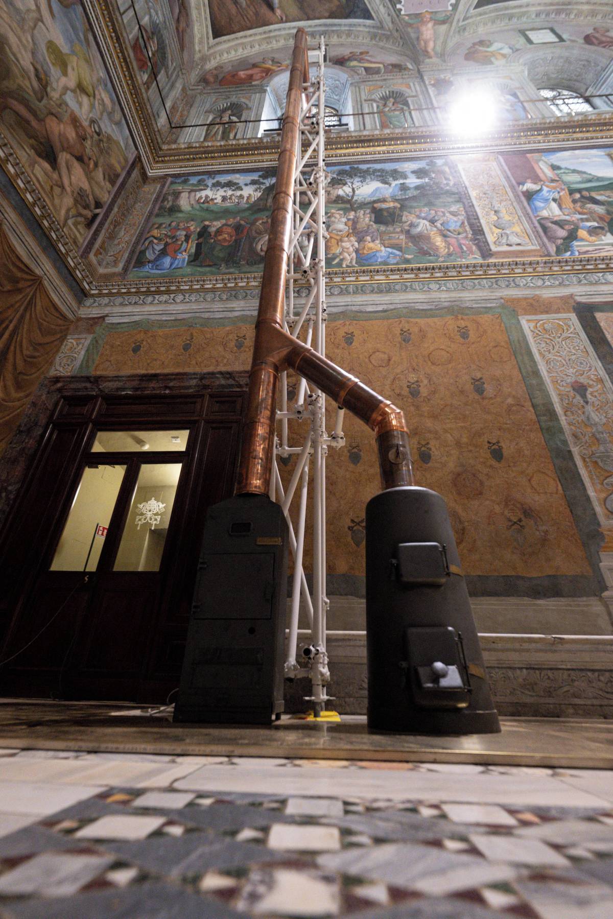 Uvnitř Sixtinské kaple jsou dočasně instalována dvě kamna speciálně pro konkláve; jedna pro pálení hlasovacích lístků, druhá pro určení barvy kouře. Obě kamna jsou připojena k malému kouřovodu – potrubí v komíně, kterým uniká kouř – který vede střechou kaple ven.