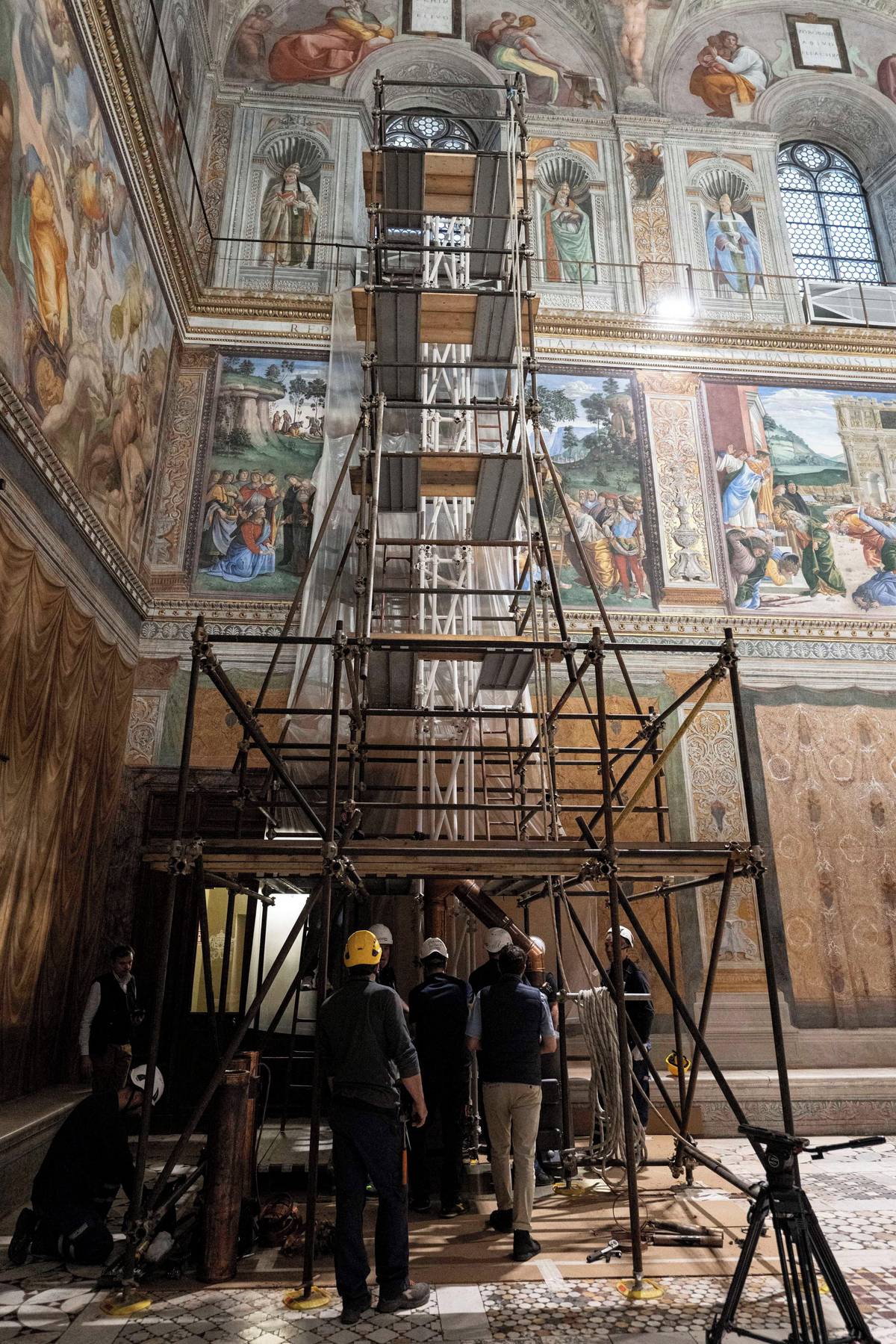 Technici pracovali na lešení v nádherném prostoru Sixtinské kaple zdobené Michelangelovými freskami.