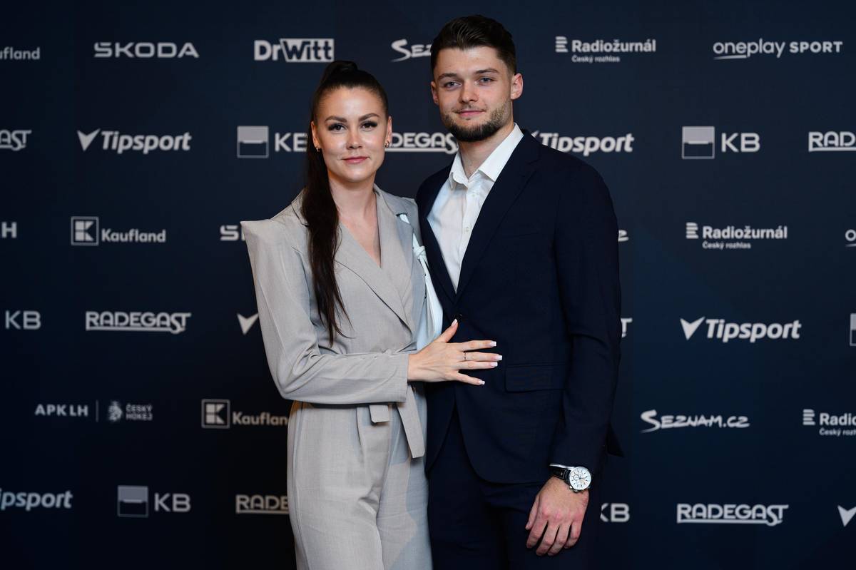 Brankář Komety Brno Michal Postava s partnerkou během slavnostního vyhlášení Hokejista sezony 2025, dne 5. května 2025 v Praze.