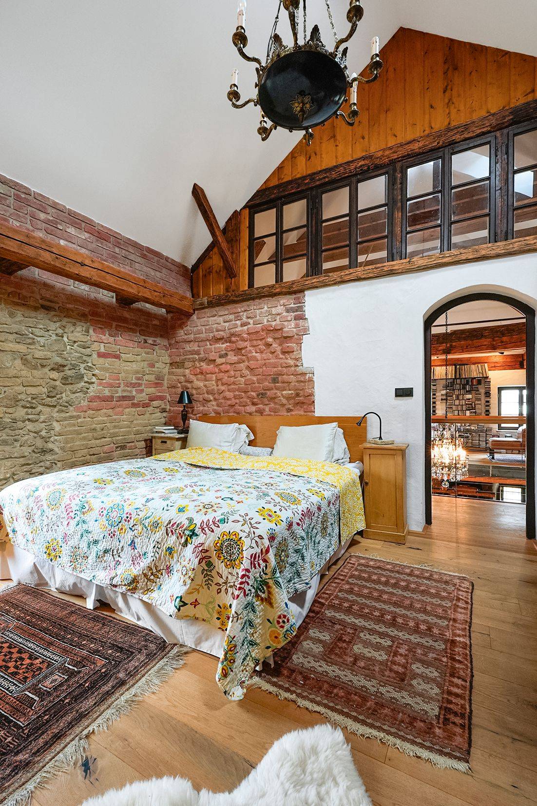 Ložnice upoutá vysokým stropem vytaženým až pod sedlovou steřchu.