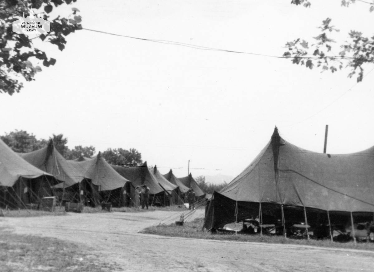 Dobový snímek vojenského tábora 109. evakuační nemocnice americké armády v Plzni na Borech