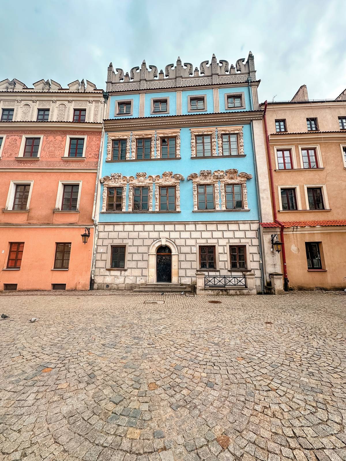 Hlavní náměstí ohraničují budovy s barevnými fasádami.