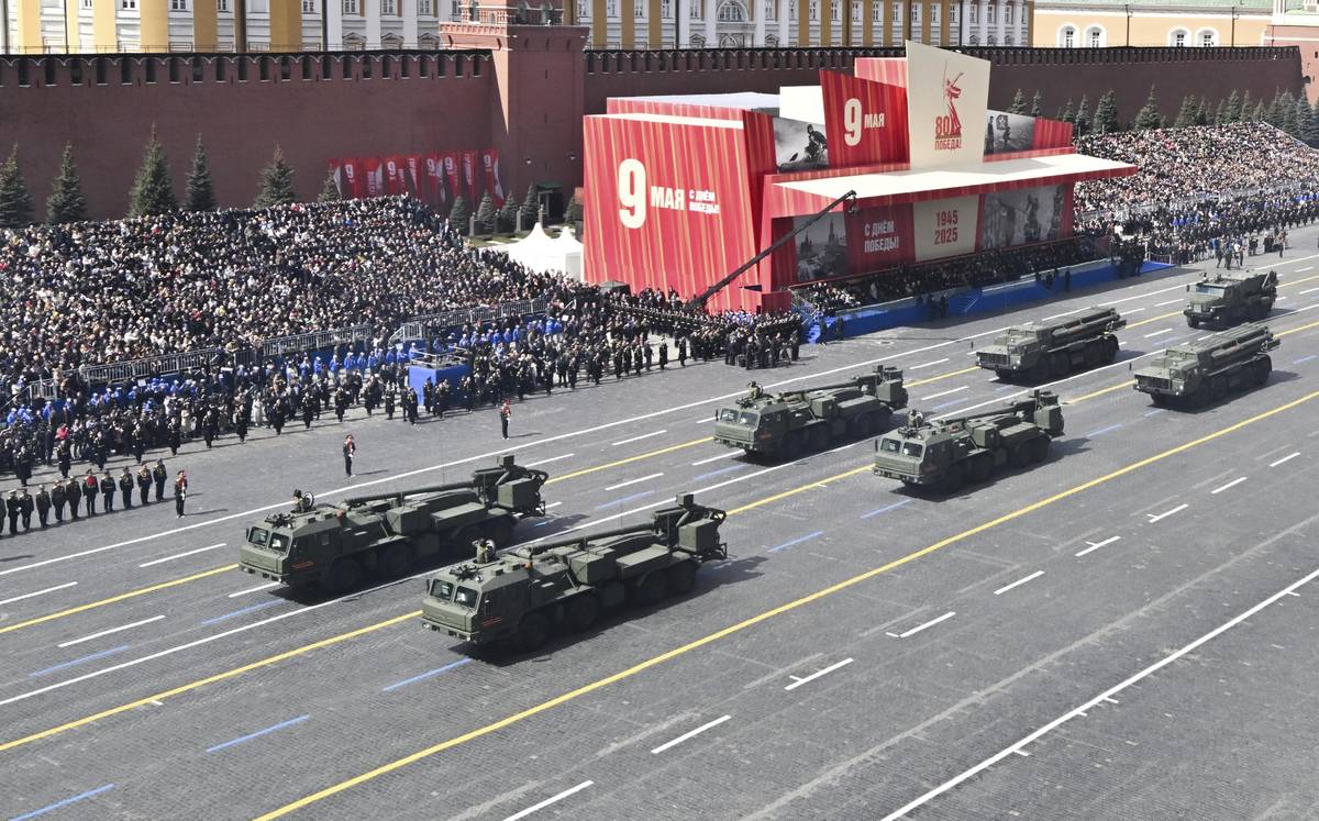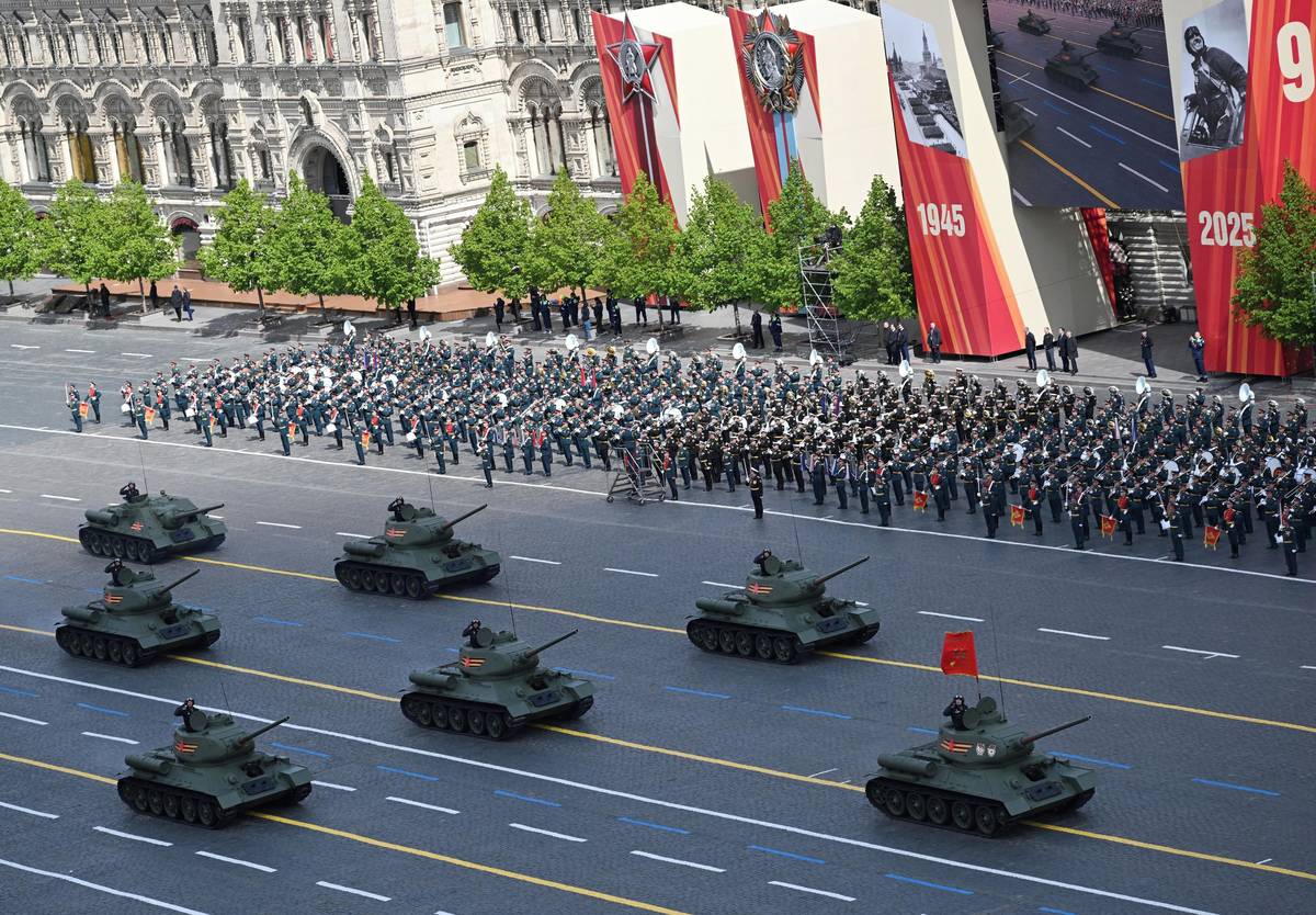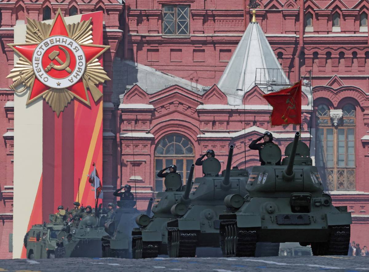 Tanky na Rudém náměstí doplněné svatojiřskou stuhou.