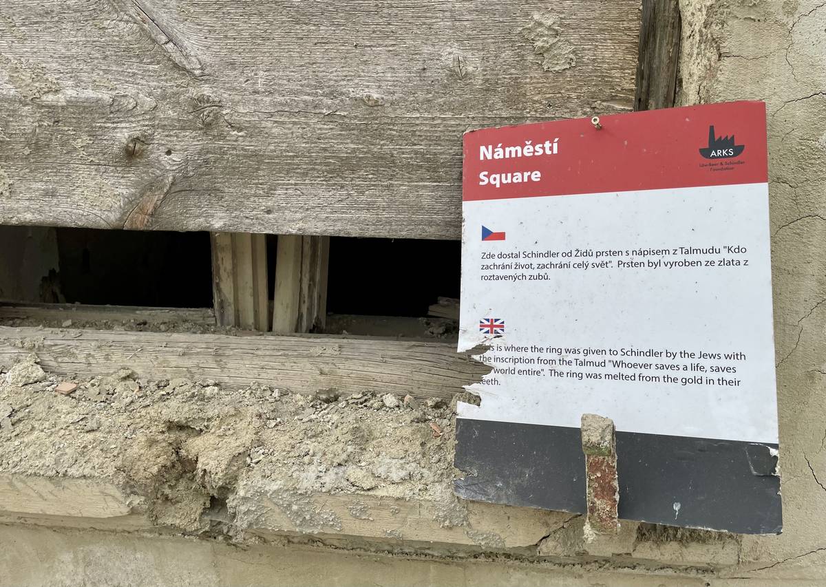 Cedule připomíná místo, kde Schnidler dostal od židovských vězňů prsten.