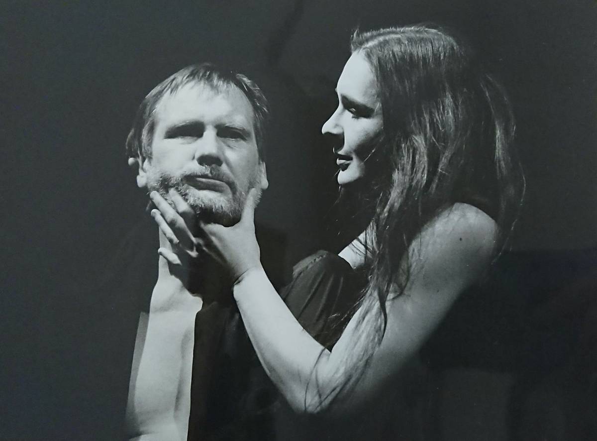 Eva Salzmannová a Boris Rösner v Shakespearově hře Antonius a Kleopatra. Národní divadlo, 1999, režie Ivan Rajmont.