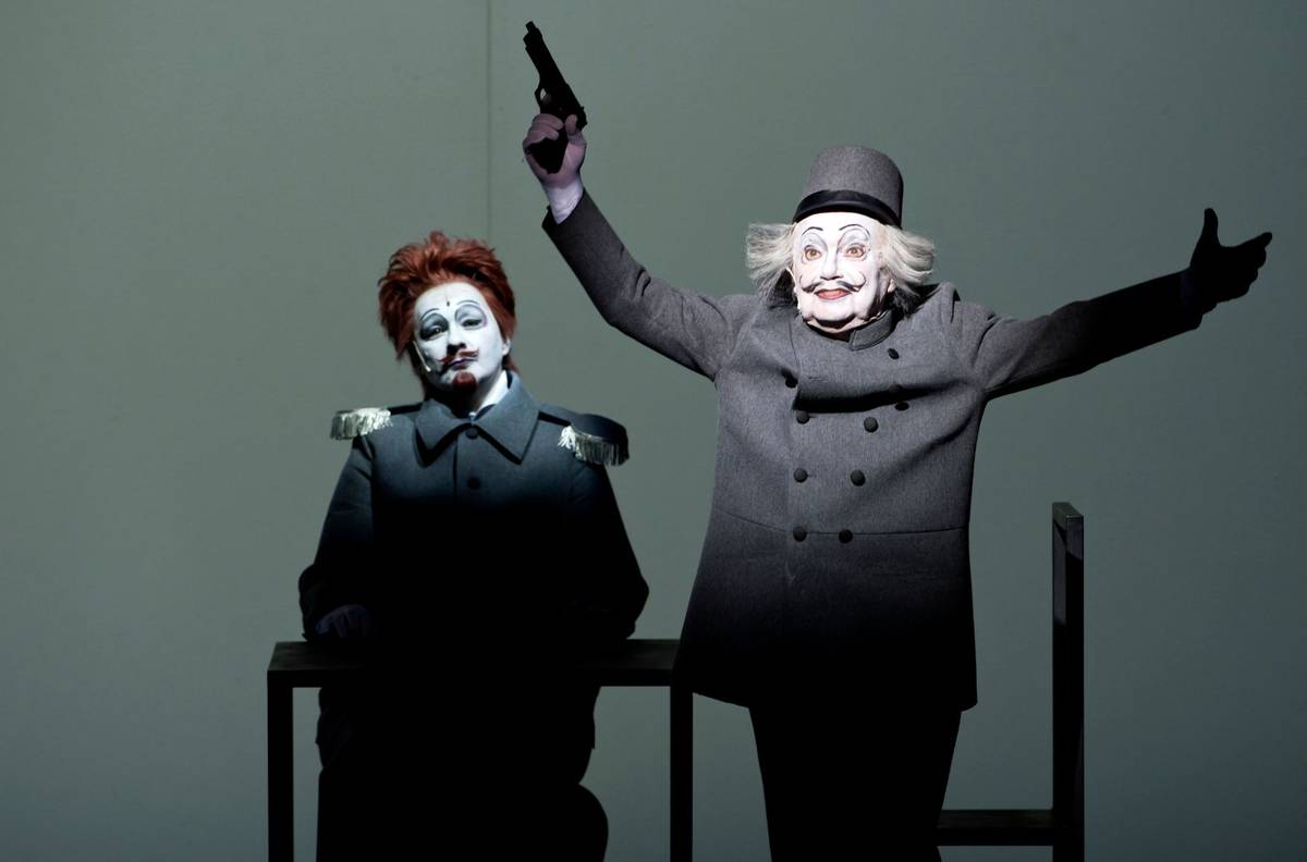 Martin Donutil, Hanuš Bor a Eva Salzmannová v Žebrácké opeře Václava Havla. Městská divadla pražská, 2020, režie David Radok.