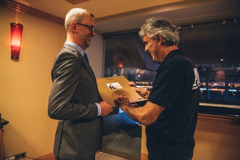 Italský tenorista převzal u příležitosti svého pražského vystoupení Zlatou desku, rok 2018. Obdržel ji z rukou obchodního a marketingového ředitele Universal Music Miloslava Zýky za tuzemský prodej alba Cinema.