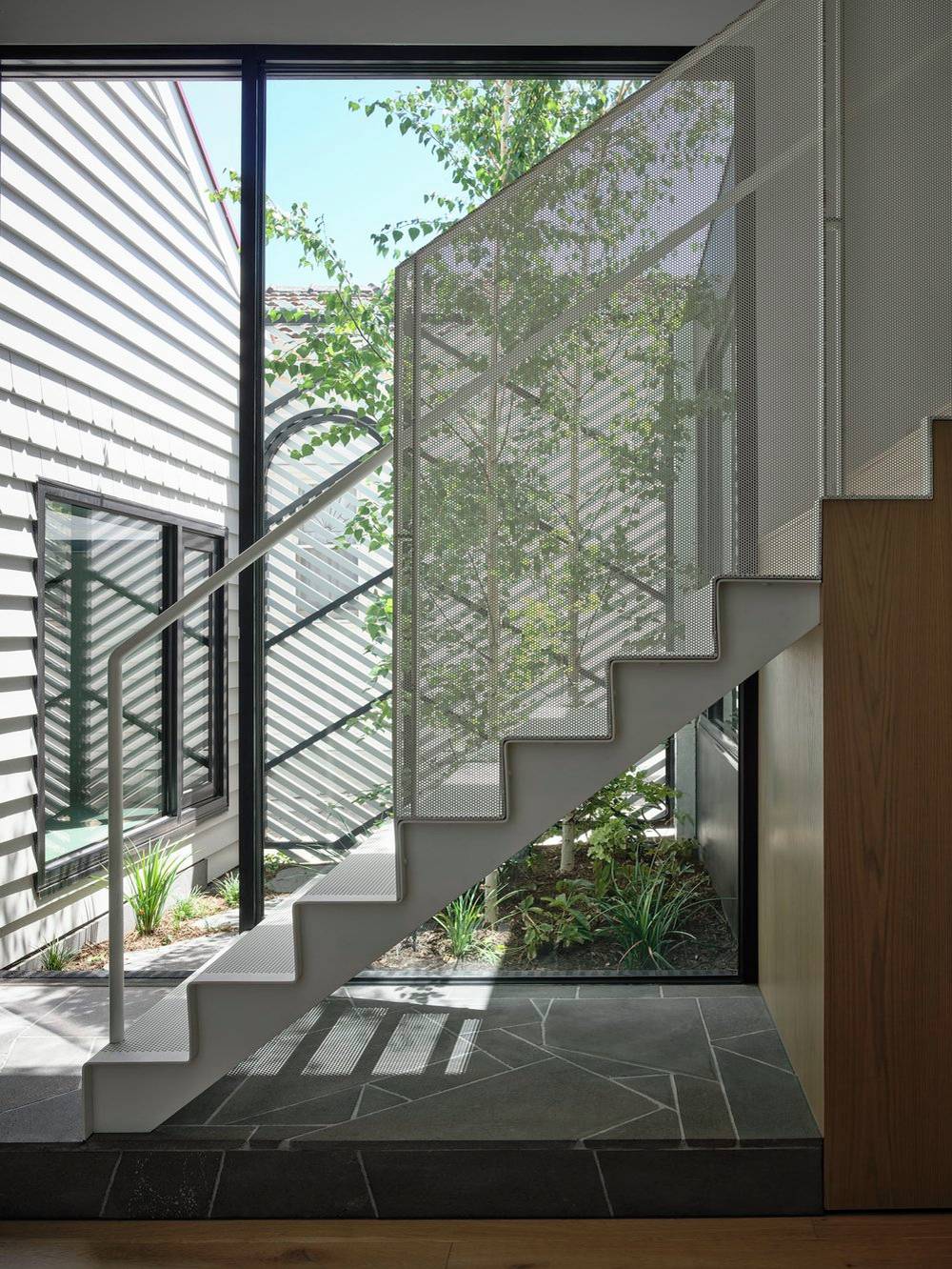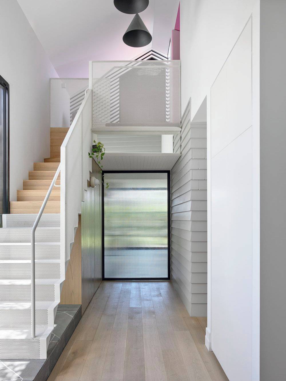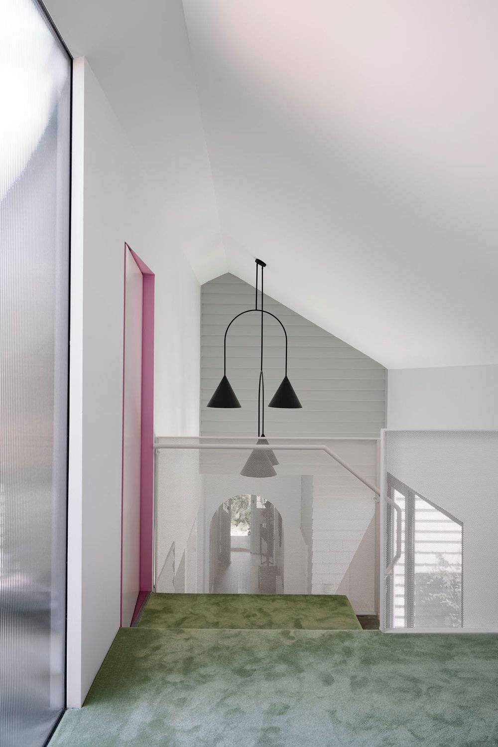 Přístavba zasahuje přes dvě podlaží. Zajímavostí je použití dvou materiálů na schodiště.
