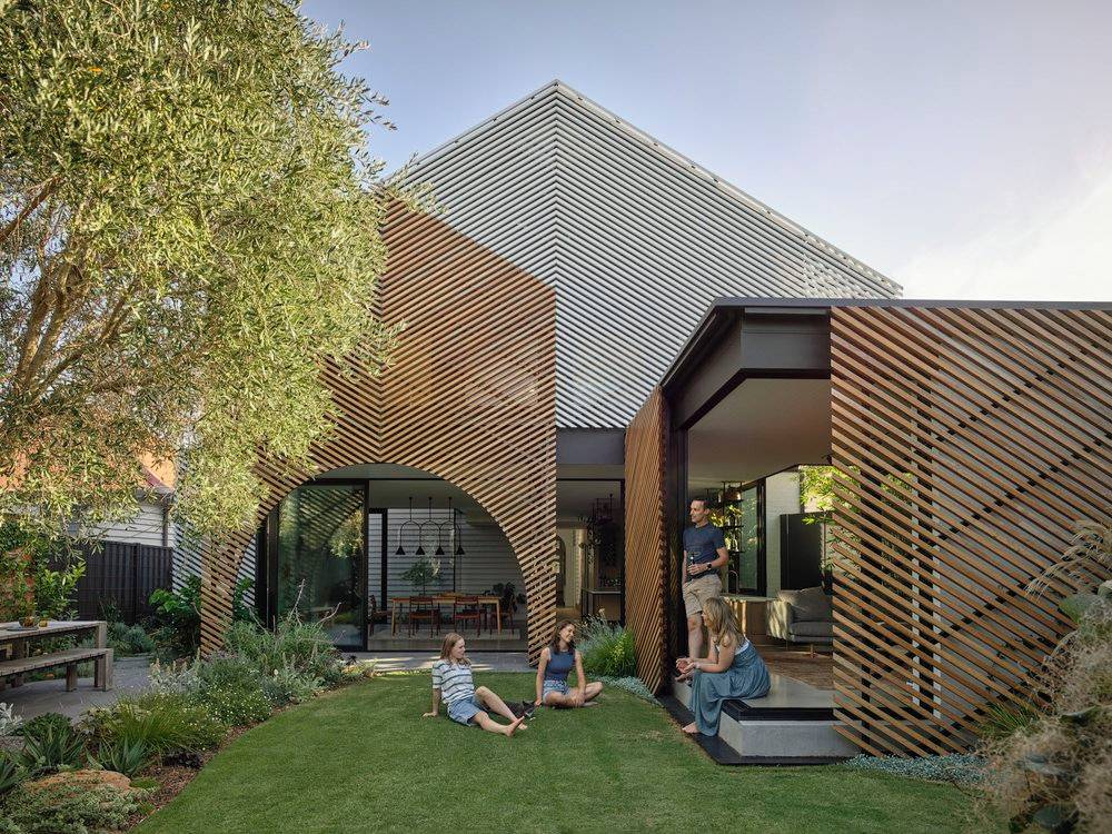 Části nové přístavby se vzájemně překrývají. Celek tak působí zajímavě a dynamicky. I díky laťoví.