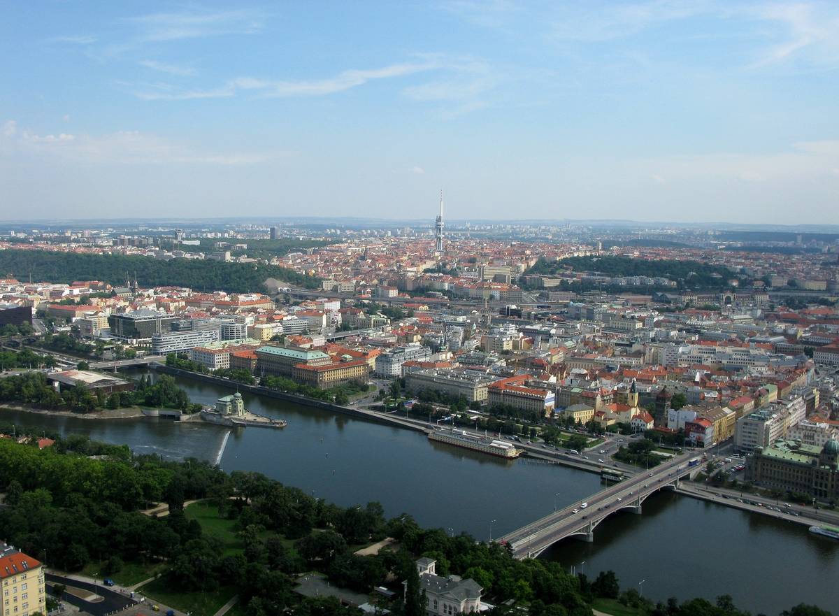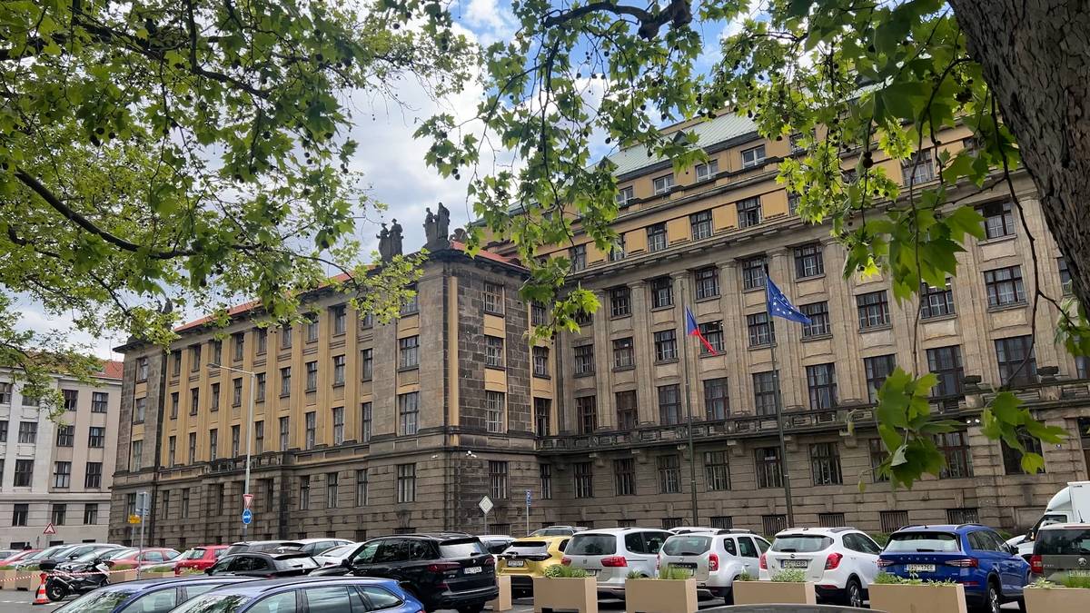 Letecký pohled na Prahu, vlevo budova ministerstva dopravy