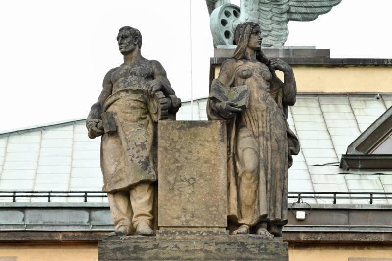 Na střeše ministerstva najdete třeba alegorické sousoší Průmysl a Věda od Ladislava Kofránka.