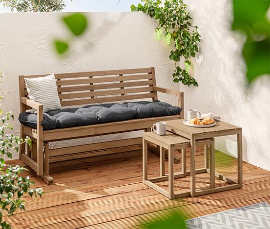 Dřevěné lavice lze vždy zpříjemnit pomocí polštářů a podsedáků, které lze pak v chladnějších dnech ještě doplnit plédy a přehozy.