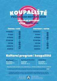 Polické koupaliště se v případě příznivého počasí otevírá v pátek 20. 6. 2025 od 13 hodin. Otevírací doba červen/září od 13 do 19 hodin. Otevírací doba červenec/srpen od 9 do 19 hodin.