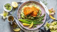 Losos s bramborovo-chřestovým pyré, dušeným špenátem a citrusovým máslem