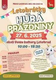 Kulturní centrum Letohrad vás srdečně zvou na Letohrátky aneb Hurá prázdniny, které se uskuteční v pátek 27. června od 10 do 18:30 v okolí Domu kultury Letohrad. Těšit se můžete na pohádku, vystoupení karatistů, živé kozy, piráty, balónkové modelování a spoustu dalších atrakcí. Chybět nebudou ani skákací hrad, malování na obličej, soutěže a zábava pro celou rodinu. Přijďte s námi oslavit začátek prázdnin!