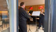 Koncert za sklem. Umělci zahráli lidem v Brně z výlohy kavárny