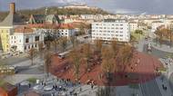 Nová podoba Mendlova náměstí v Brně: uprostřed červený kruh se stromy a sochou