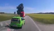 Nebezpečný manévr rozvozu pizzy. Při předjíždění u Kostelce se řidič sotva stihl zařadit před protijedoucím kamionem
