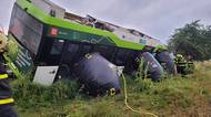 /FOTOGALERIE/ Na Třinecku havaroval linkový autobus na elektrický pohon. Skončil nebezpečně nakloněný v příkopu. Hasiči z něj po stabilizaci museli nejprve vyprostit tři téměř ležící osoby, včetně řidiče. Náročný zásah trval až do večera, vyproštění vozu zabralo několik hodin.