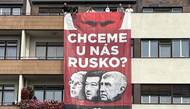 Skupina Kaputin vyvěsila na budovách v Praze plakát s Putinem a českými politiky