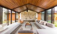 K obývání takovéto „chaty“ na víkendy by nás asi nikdo nemusel dvakrát nutit. Devízou nádherného víkendového sídla je veliký pozemek, krásný bazén, spojení se zahradou obrovskými prosklenými zdmi, netypický půdorys do tvaru písmene H i neotřelé vnitřní provedení s odhalenými střechami. Dvě rozdílné zóny domu jsou spojeny centrální prosklenou částí.