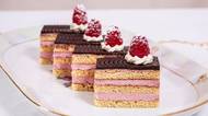 Pruhované řezy plné malin. Tuhý krém vznikne promícháním malinového pyré s vyšlehaným máslem a sněhem s horkým cukrovým rozvarem. Tím je sníh pevný a stabilní.
