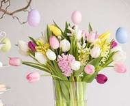 Veselý květinový styl na Velikonoce? Zkombinujte kvetoucí cibuloviny s některými pučícími větvemi. A nezapomeňte přidat vajíčka!