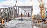 Za pomoci obřího autojeřábu usadili ve středu stavbaři na své místo mnohatunovou konstrukci nové lávky přes Jizeru v blízkosti železničního mostu.