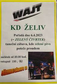 Dnes 6.4.2023 od 20:00 se v sále kulturního domu v Želivě uskuteční taneční zábava skupiny WAJT. Vstupné 150,- Kč