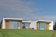 Jednopodlažní dům natočený velkými okny do přírody jako by očima pozoroval nedaleké Hostýnské vrchy. Zároveň svým obyvatelům poskytuje dostatek pohodlí a soukromí i před zatím neznámými příbytky v sousedství.