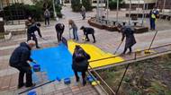 Aktivisté malovali na dlažbu ukrajinskou vlajku, Rusové po nich házeli vajíčka