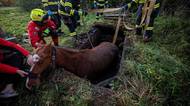 Kůň se propadl do jímky. Z bahnité propasti ho musela vyprostit až těžká technika
