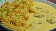 Zadělávané kuře ve zlaté omáčce zní velmi lákavě. Opravdové zlato tam ale nehledejte, jde o kuře se smetanovou omáčkou a sýrem. Servírované s těstovinami dobře vypadá a ještě lépe chutná.