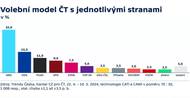 Nejnovějšímu volebnímu průzkumu společnosti Kantar pro Českou televizi dále vévodí hnut ANO s 32,5 procenty, následuje koalice Spolu se svými 22,5 procenty a Piráti s 11 procenty. Volební model ČT byl představen v rámci nedělního pořadu Otázky Václava Moravce a ukazuje pokračující mírný pokles preferencí pro hnutí Andreje Babiše.