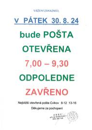 V pátek 30.8.2024 bude odpoledne zavřená pošta Mařenice