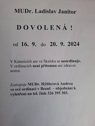 MUDr. Ladislav Janitor oznamuje, že od 16.9. do 20.9.2024 se na Skalsku ani v Katusicích NEORDINUJE. V ordinacích není přítomna ani zdravotní sestra.