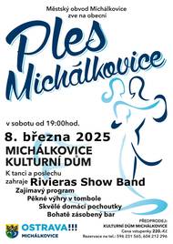 Městský obvod Michálkovice zve na Ples Michálkovice 🎉 Datum: Sobota, 8. března 2025 Čas: Od 19:00 hodin Místo: Kulturní dům Michálkovice 🏛️ Co vás čeká? 🎶 K tanci zahraje: Rivieras Show Band 🎊 Zajímavý program 🎁 Pěkné výhry v tombole 🍽️ Skvělé domácí pochoutky 🍹 Bohatě zásobený bar Předprodej vstupenek a rezervace: 📞 Tel: 596 231 565 📞 Mobil: 604 212 296 Těšíme se na vaši účast! 🌟