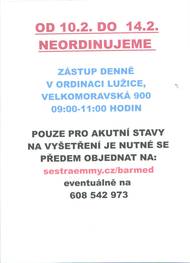 MUDr. Jiří Bartoš oznamuje, že ve dnech od 10. – 14. 02. 2025 neordinuje. Zástup v ordinaci Velkomoravská 900 denně od 9.00 do 11.00 hodin, pouze akutní stavy, na vyšetření je nutné se předem objednat na tel. 608 542 973.