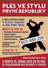 📢 Ples ve stylu První republiky – poslední šance na vstupenky! 🎩✨ Vše se chystá, aby zítřejší ples v duchu První republiky byl noblesní, okouzlující a nezapomenutelný. Těšit se můžete na elegantní dobovou atmosféru, živou hudbu v podání orchestru Václava Marka, působivé předtančení i skvělou společnost. 🥂 Chcete být u toho? Stále jsou volné vstupenky, které můžete zakoupit na místě nebo si je rezervovat na tel. 📞 603 489 256. 👠🎶 Oblékněte se do elegance první republiky a přijďte si užít večer plný hudby, tance a skvělé zábavy! 📅 Kdy? Sobota 15. února 2025 od 20:00 📍 Kde? Společenský sál Na hřišti, Tišice ✨ Těšíme se na vás!