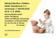Dětská lékařka v Úštěku MUDr. Šanderová oznamuje, že od 3.-7.3.2025 má dovolenou. Akutní případy ošetří MUDr. Chvojková v Litoměřicích, Jiřího z Poděbrad 7 (Kocanda) v ordinační době: Po, Út, Čt, Pá od 8-10 hod, St 12-14 hod.