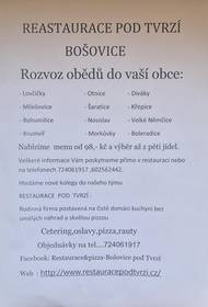 Restaurace Pod Tvrzí Bošovice nabízí rozvoz obědů do naší obce, denní menu od 98,- Kč a výběr až z pěti jídel... Tel.: 724 061 917 a 602 562 442