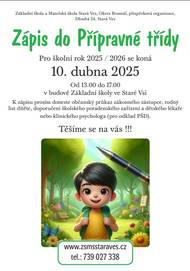 Základní škola a Mateřská škola Stará Ves zve rodiče na zápis do Přípravné třídy pro školní rok 2025/2026, který se koná 10. dubna 2025 od 13.00 do 17.00. Nezapomeňte přinést potřebné dokumenty.