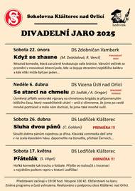T. J. Sokol a jeho divadelní soubor Ledříček přichystal s podporou obce na jarní část divadelní sezóny pro klášterecké publikum celkem čtyři představení.